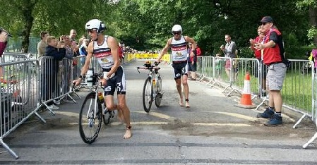 After swimming 3.9km (equivalent to 154 lengths of the pool) and cycling 180km (equivalent to 120 laps of the track at Les Quennevais) Dan and Stephen came off the bike together (see picture below) and ran together for around 15km before Dan broke clear and built a lead which peaked at over 5 minutes.