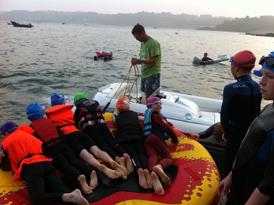 (27/09/13) What a fantastic way to wrap up the summer. Around 30 athletes got together for our last session at St Catherines for 2013 for a "fun night" in the water with inflatable toys, fins and bodyboards the order of the day. However, the highlight of the night was Sandy Hugh's RIB and Donut rides across the bay.