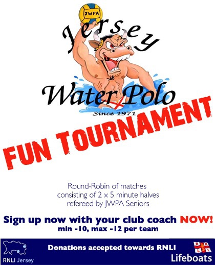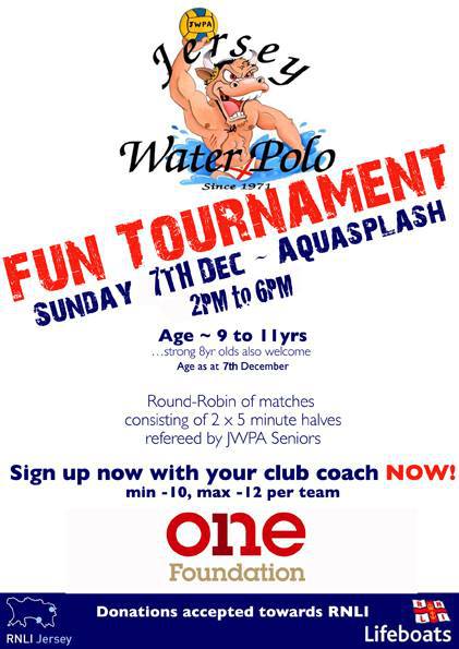 (21/11/14)Jersey Water Polo Club is organising a fun water polo tournament at Aquasplash on Sunday 7th December at Aquasplash 2pm to 6pm. I am waiting for more information but based on last year's event information it is for teams made up of 8 to 11 year olds. Teams from the swimming clubs and lifesaving club are likely to be taking part (you may also have been asked by your swimming club to join their team).